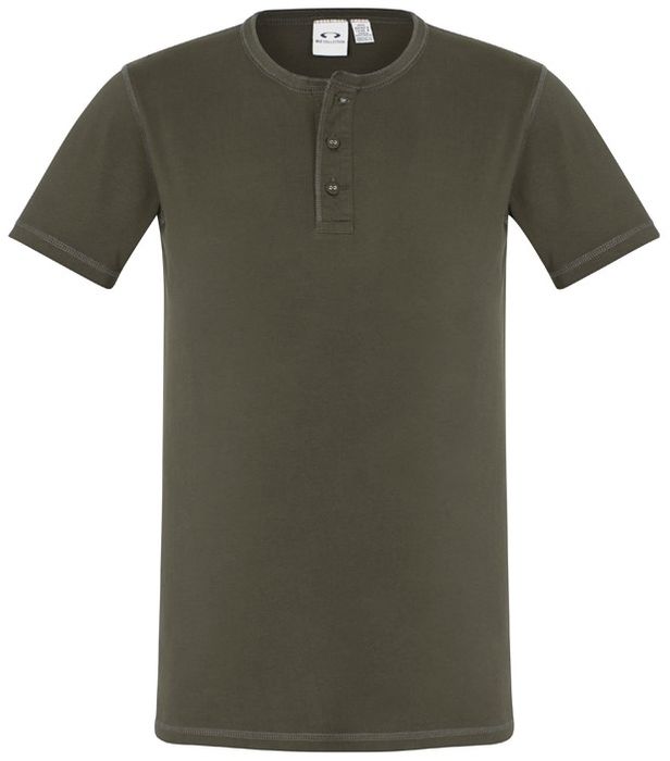 - Henley style placket with fabric covered fish-eye buttons